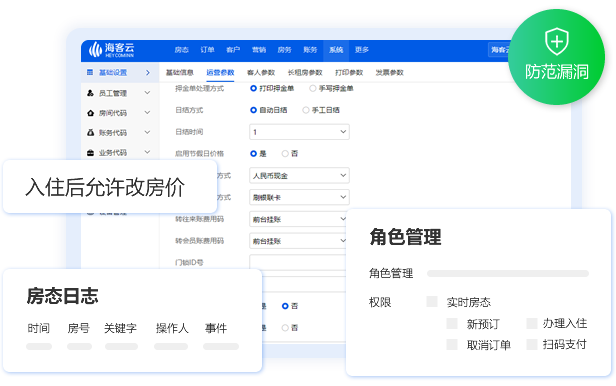 通过房价控制、房态日志、发卡管理、价格授权、角色管理、财务审核,严格监管关键环节,构建多级漏洞防范体系